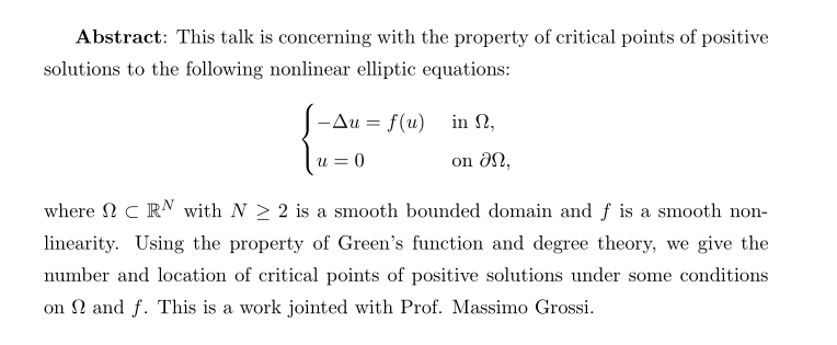 数学与系统科学研究院从事博士后研究。2019年9月-2020年8月在意大利罗马第一大学从事访问研究。研究方向为非线性泛函分析与非线性椭圆方程。主要研究兴趣是非线性椭圆方程解的定性性质的分析。主要获湖北省优秀博士论文、湖北省楚天学者之“楚天学子”计划等。发表论文10余篇,多数发表在JMPA、CV and PDE、JDE等期刊。主持国家自然科学基金青年基金、中国博士后基金等。