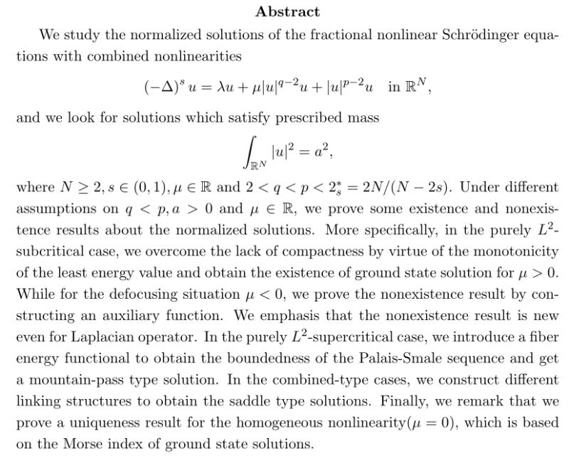报告题目:Normalized Solutions to the Fractional Schrodinger Equations with Combined Nonlinearitie