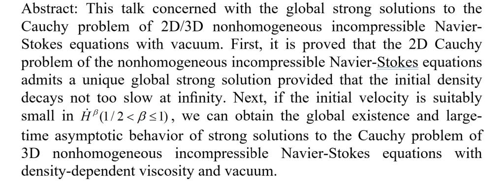 报告题目: On global strong solutions to high-dimensional nonhomogeneous incompressible Navier-Stokes equations with vacuum