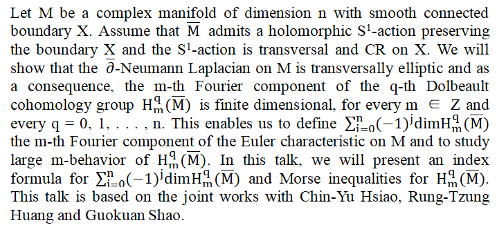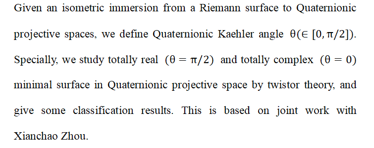 In this talk, I will report some recent results about the extension of (quasi-)plurisubharmonic functions on (compact Kähler) manifolds. I’ll also introduce the extension when the submanifold has holomorphic retraction structure, which is the case of a joint work with Prof. Zhiwei Wang and Prof. Xiangyu Zhou.