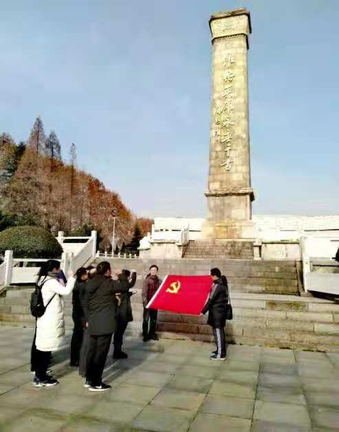 上午11:30左右,大家怀着无比崇敬和激动的心情走进纪念馆园区内。首先映入大家视野的是雄伟的淮海战役英雄纪念碑,纪念碑上有周总理的亲笔题词:“淮海英雄永垂千古”。在纪念碑前,参加活动的全体党员面对鲜艳的党旗,庄重地举起右手,进行了庄严的重温入党誓词活动,再次表达了为共产主义奋斗终生的决心。