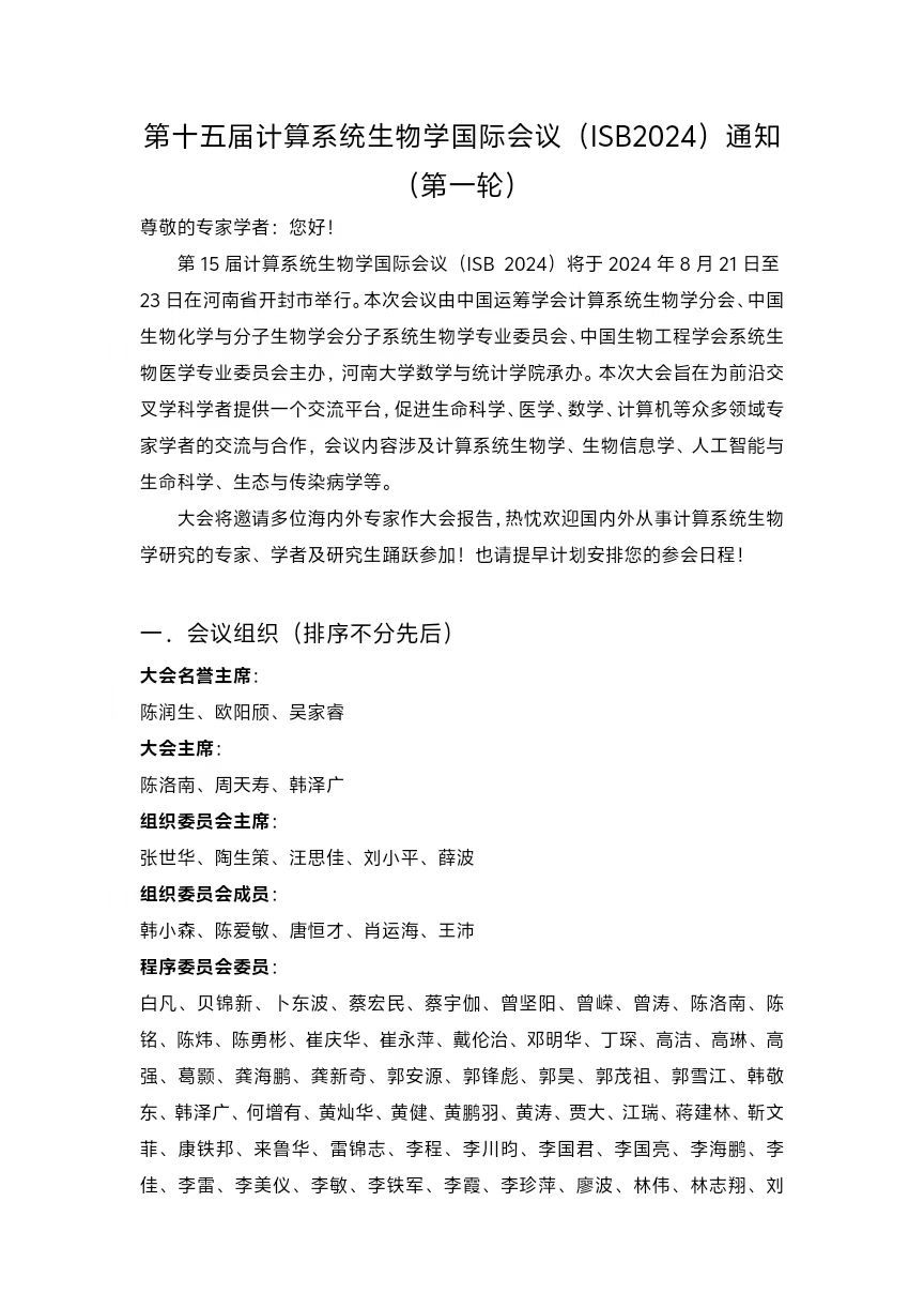 第十五届计算系统生物学国际会议(ISB2024)通知 (第一轮)