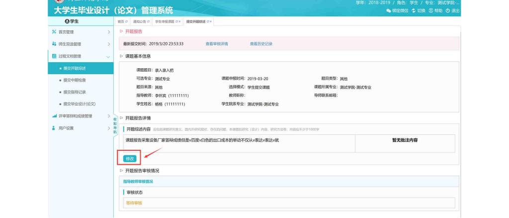 ※完善好开题报告内容后,点击提交即可,等待指导教师审核。
