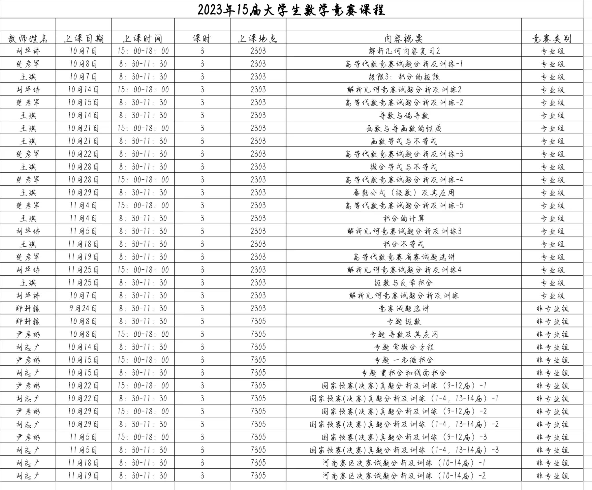 同学们好, 2023年全国第15届大学生数学竞赛预赛初定于11月11日(周六)9:00-11:30举行。为帮助同学们做好赛前准备工作,性爱a片 将组织有经验的老师进行赛前免费培训, 培训分为专业组和非专业组, 具体培训内容和时间详见下表