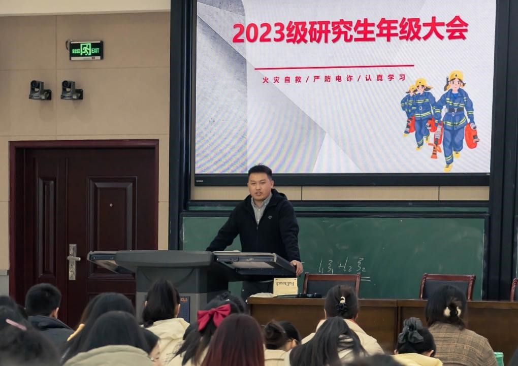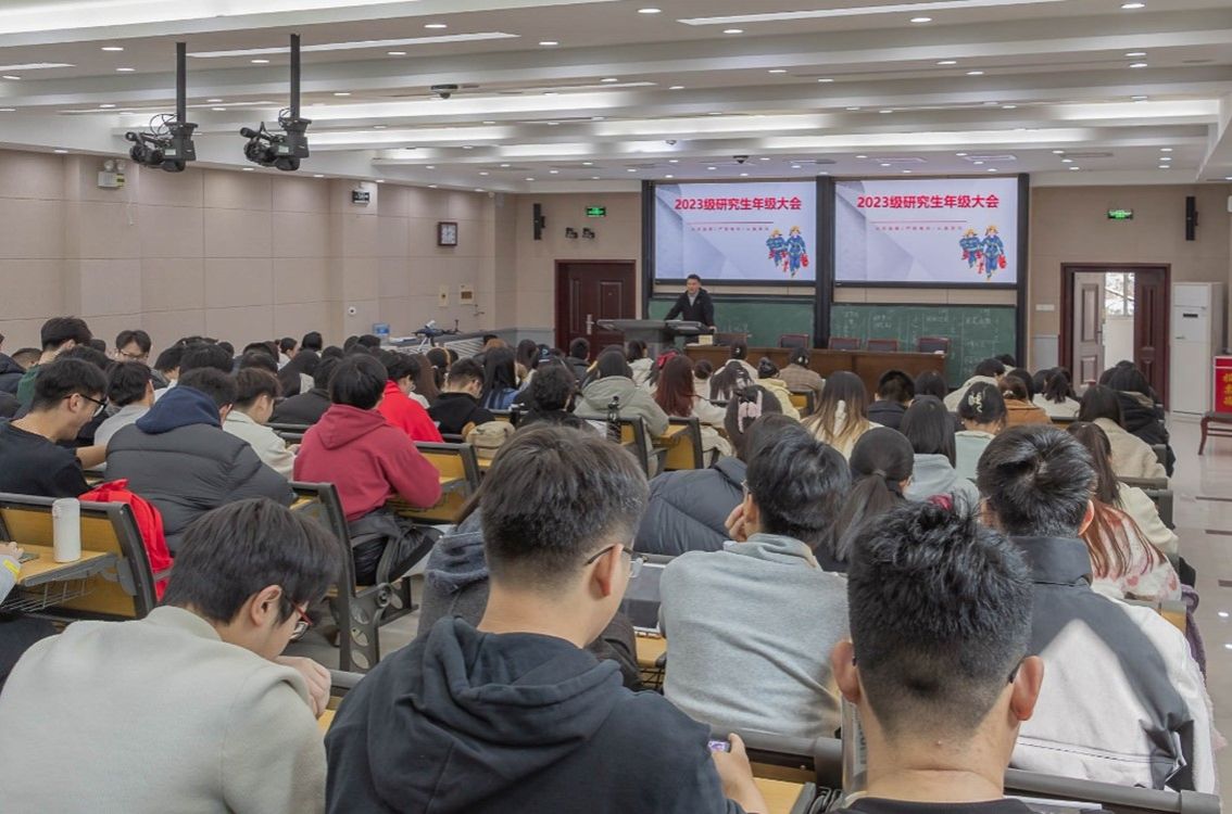 在南阶梯教室召开2023级研究生年级会。辅导员陈顺杰主讲,2023级全体研究生参加。