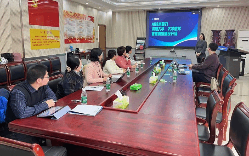 教务办公室主任尹彦彬、数学教育系主任汪叶及部分教师代表参加。研讨会邀请超星泛雅集团河南分公司课程建设项目经理王祥对超星智慧教学平台的AI应用模块进行介绍和操作演示,为大学数学智慧课程建设提供个性化指导建议,与会教师代表就高等数学、线性代数等课程中AI赋能教学问题展开深入讨论,针对数智化课程与数字教材制定详细的建设方案。