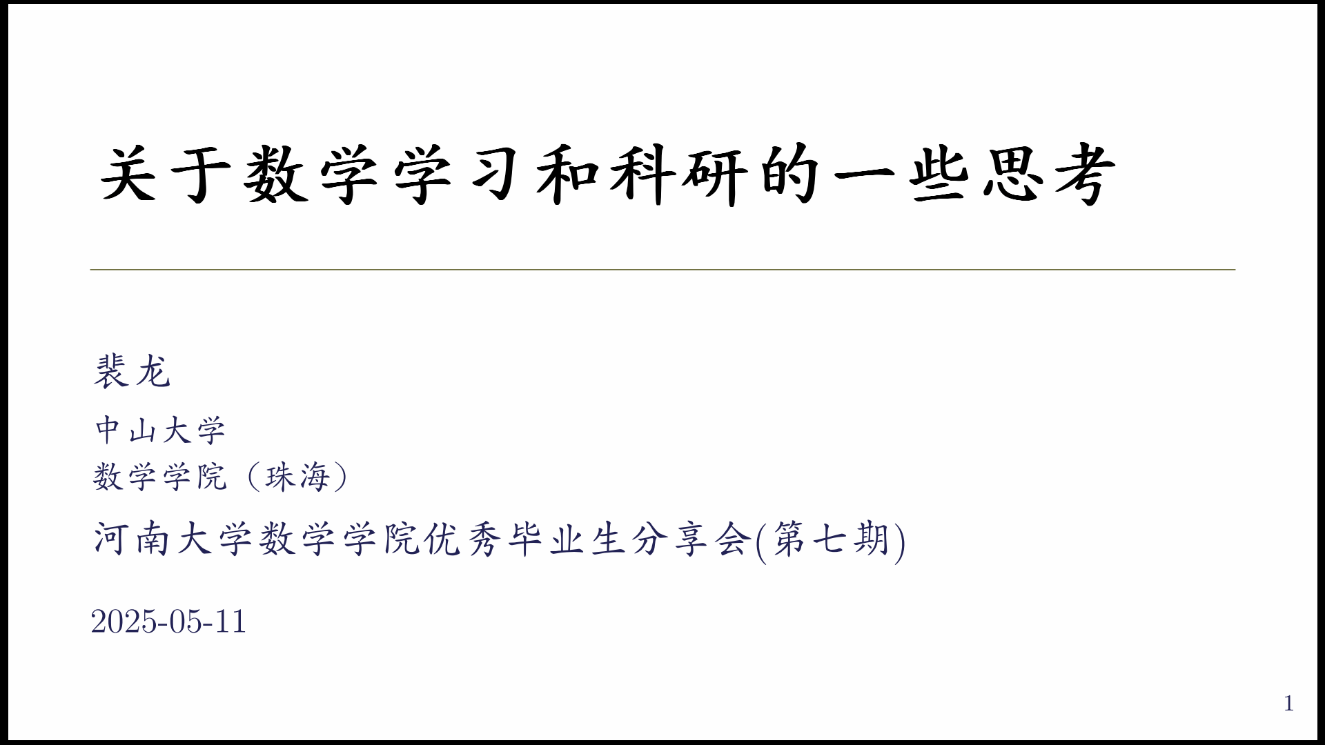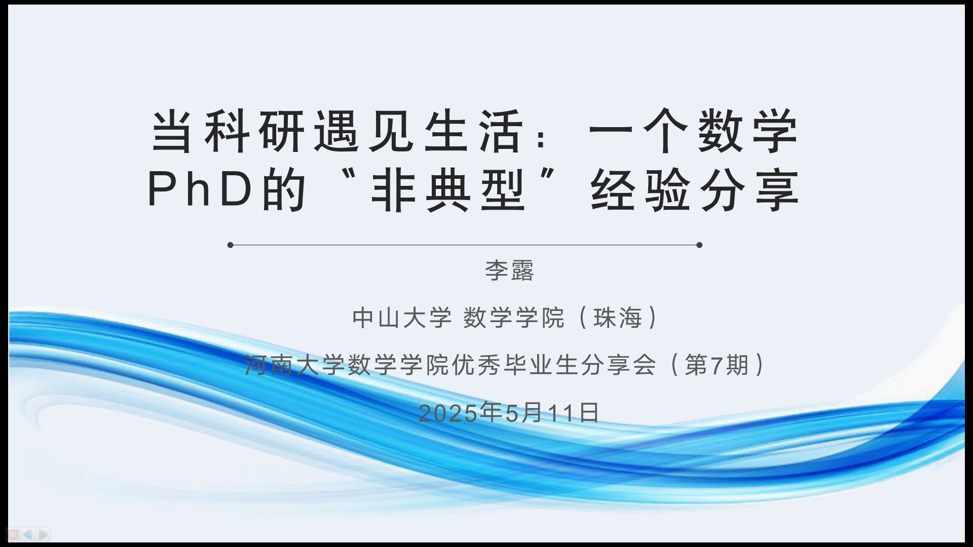 李露以“从河大到世界:我的成长轨迹”开启分享,讲述了不同求学阶段的经历和感悟,并表示本科阶段母校优秀的教师团队、浓厚的学习氛围为个人成长奠定了非常重要的基础。围绕“如何面对研究方向的转变”、“AI时代下的数学研究”、“科研和生活真的矛盾吗?”、“科研路上的心理调节”等话题,她分享到,科研的意义在于赋能生活和回应现实、承认并允许自己“不完美”、节奏感比平衡感更重要、科研不是一场马拉松而是一场间歇跑;“科研是一种长期博弈、科研目标设定要‘具体、长期、短期、带有模糊空间’、情绪低落时,不要相信‘当下的自己’,只做记录,不做判断”;“某时刻学到的东西一定在未来某时刻以某种方式回馈你”;“每个人的节奏不同,要做独特的自己”。并以“愿你在理性中不失柔美,在生活中不忘仰望”结束了分享报告。