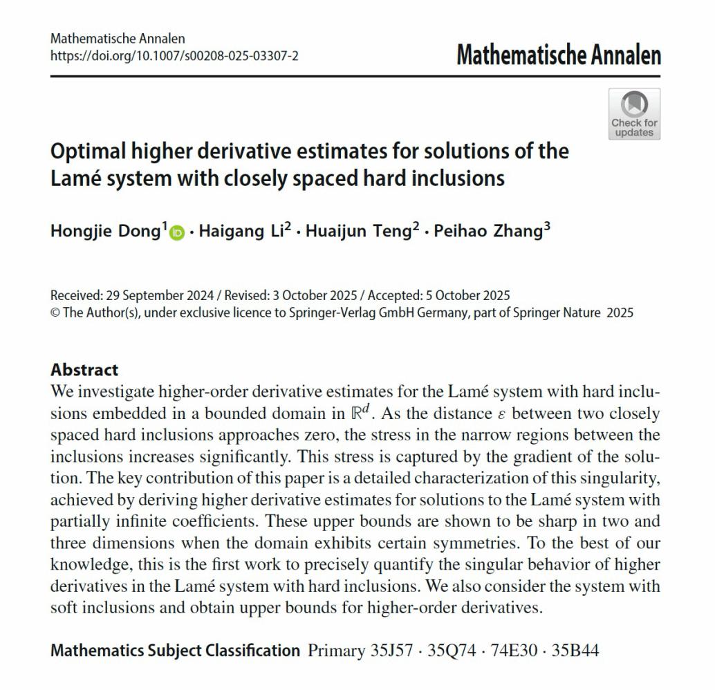 博士后张培豪与美国布朗大学董弘桀教授、北京师范大学李海刚教授等合作者在偏微分方程与材料科学交叉研究领域取得新进展,相关成果以《Optimal higher derivative estimates for solutions of the Lamé system with closely spaced hard inclusions》为题,发表于学术期刊《Mathematische Annalen》。该研究聚焦于含有紧密相邻硬夹杂的Lamé系统,建立了系统解的高阶导数的最优估计。