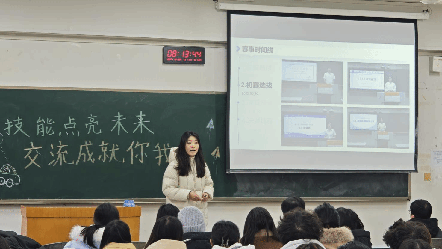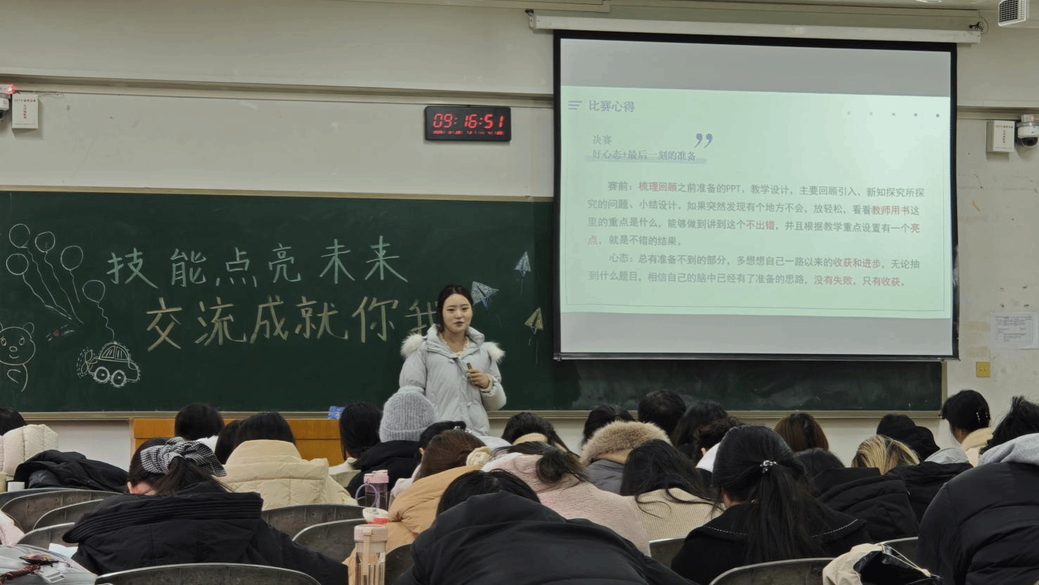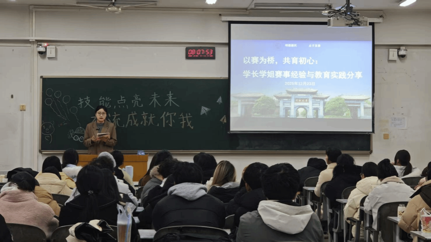 吴梓萌、王园、孙梦岩、孙驰等四位在2025年全国“田家炳杯”全日制教育硕士教学技能大赛中斩获佳绩的同学,聚焦赛事的核心内容,从赛事流程与整体认知、各阶段备赛策略、赛程心态引导、专业技能与工具应用四大板块进行系统讲述,为在场师生提供了实用且全面的备赛指南。
