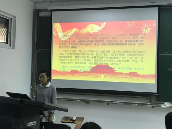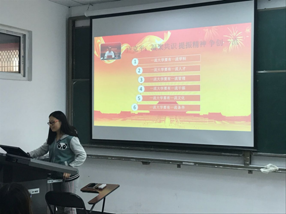 经过学习,团支书让同学们就校党委书记卢克平、校长宋纯鹏的重要讲话内容积极发言,发表自己的看法。在团干部的带头作用下,团员更加积极发言,都抒发了建设一流大学的个人独特见解。随后团员们针对今后具体实际行动的建议,提出了修改和补充。团支书提出了全体宣誓仪式,团员承诺今后将作出改进,并对照自身实际将建议落实到点,努力做一个合格的共青团员。活动快结束时团支书要求同学在活动后写一份字数不限的活动心得电子版,定期回顾校党委书记卢克平、校长宋纯鹏的重要讲话,了解其精髓,使之成为我们的精神追求和行为准则。