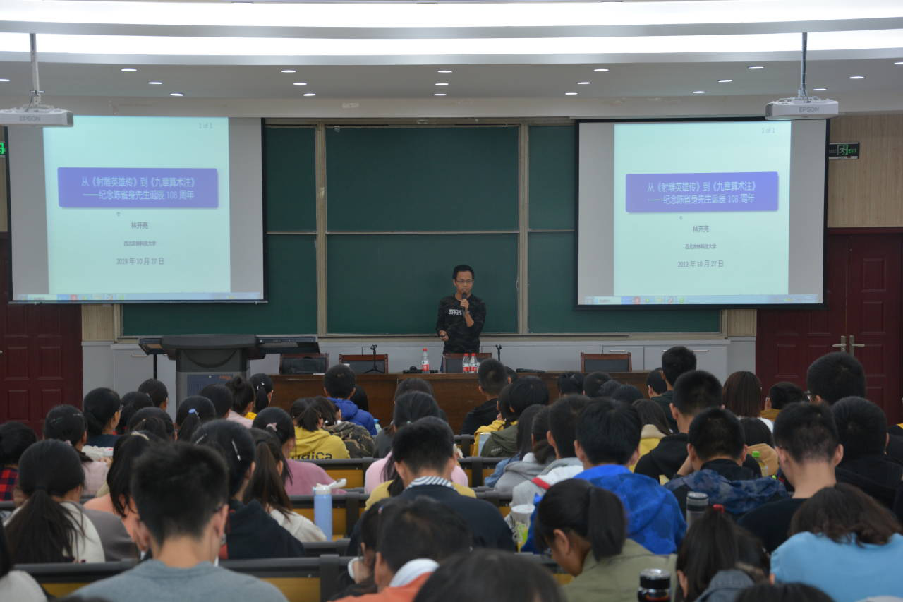 27日下午,林开亮作《从<射雕英雄传>到<九章算术注>——纪念陈省身先生诞辰108周年》专题报告,报告会由性爱a片