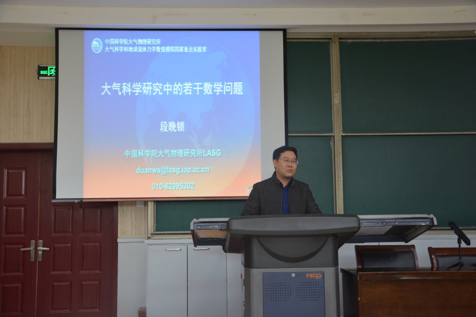 副院长王波主持。段晚锁强调了数学在大气科学研究领域的重要性,然后具体介绍了大气科学的含义和基本内容,列举了大气科学研究领域的若干个数学问题并通过著名的“蝴蝶效应”生动直观地向同学们讲述了数学在大气科学领域中所发挥的重要作用。