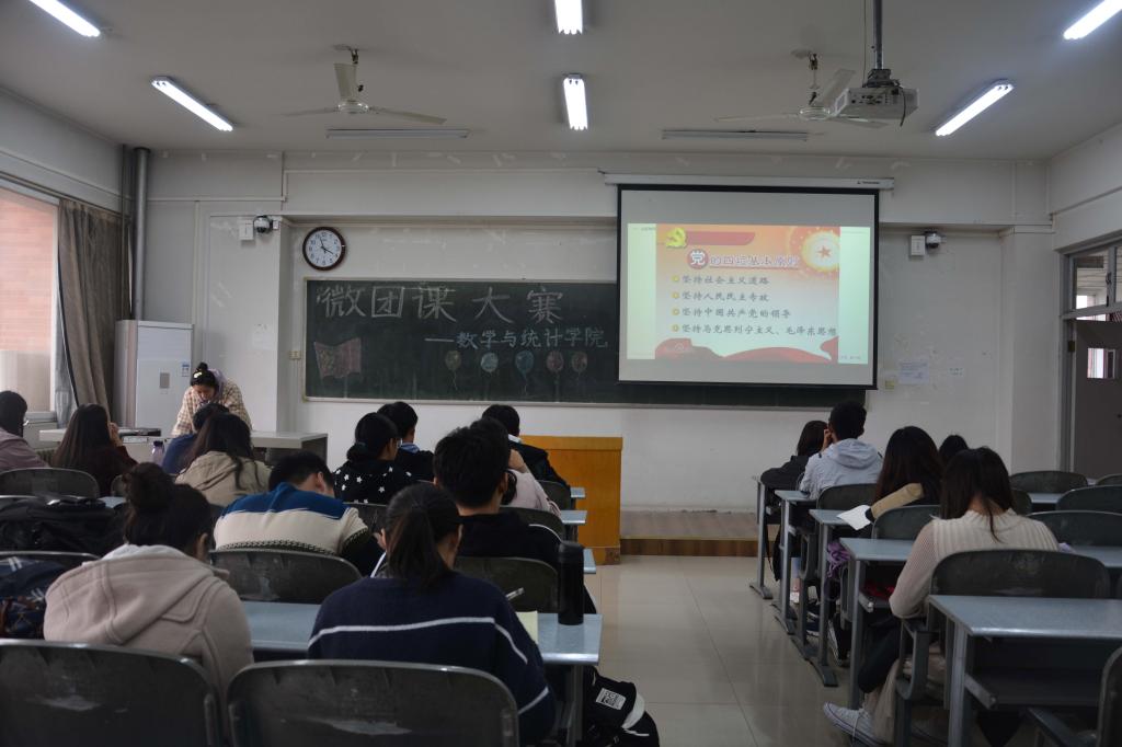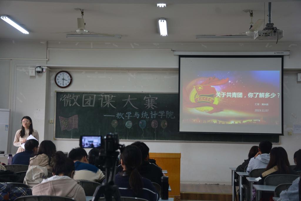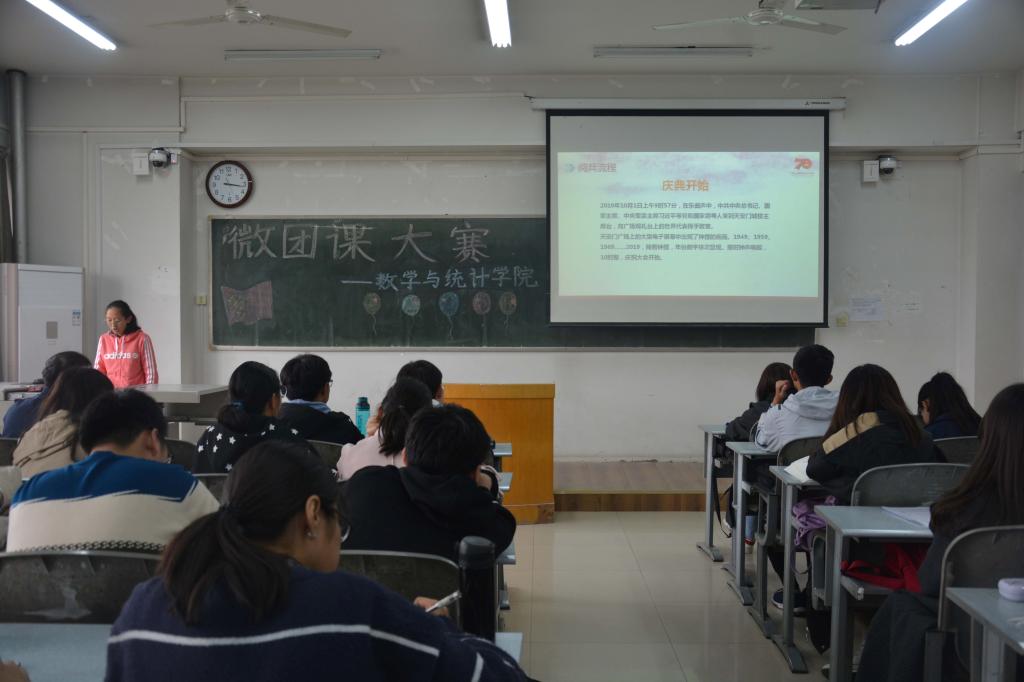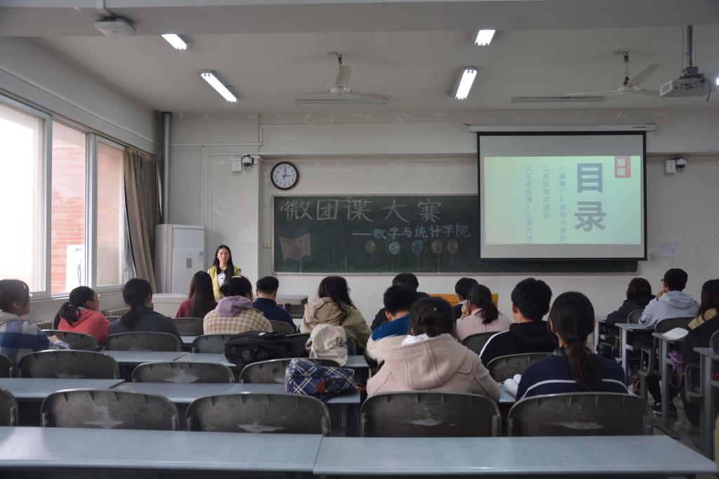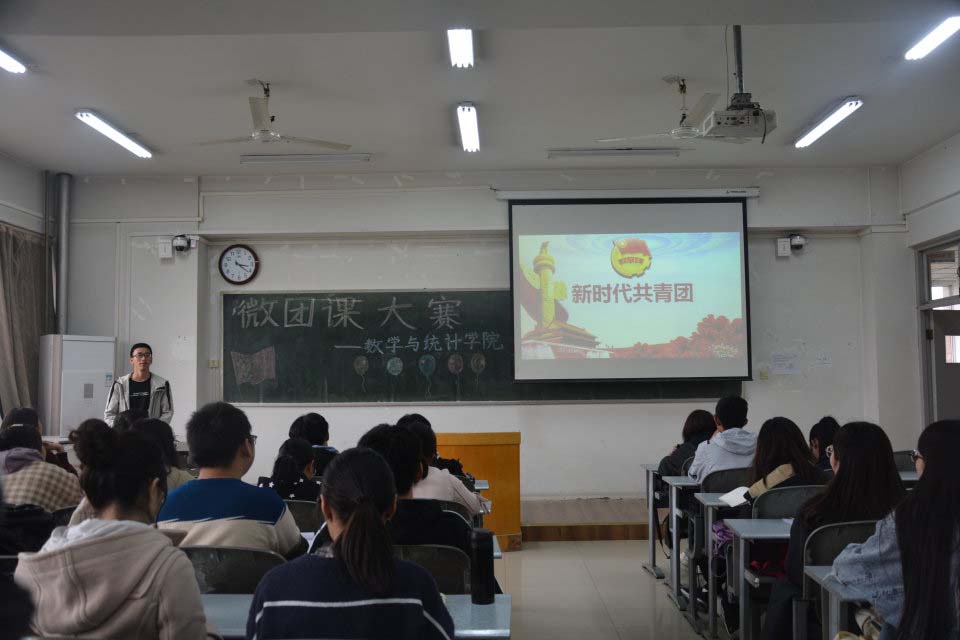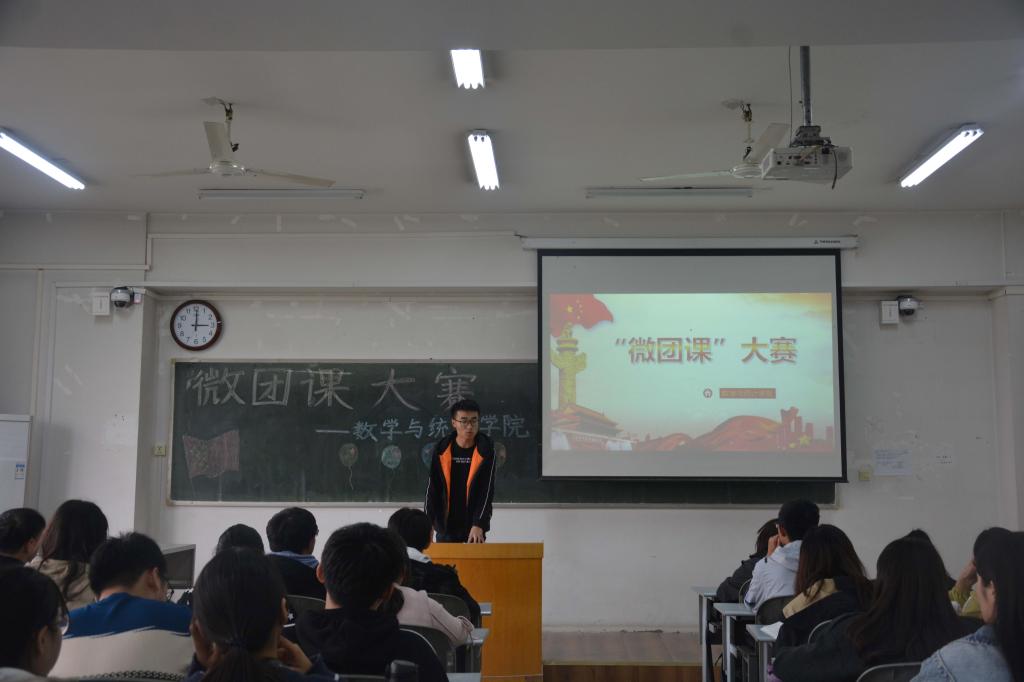 学生团干部在7304教室集中观看了“微团课”大赛初赛展示,参赛的五位团支书分别是来自2017级数学与应用数学(实验班)专业的王裕斐、2018级信息与计算科学专业的陈艳晓、2018级统计学专业黄林微、2019级统计学专业姚翔上、2019级金融数学专业郭铭萱。比赛由2018级羌准准主持。