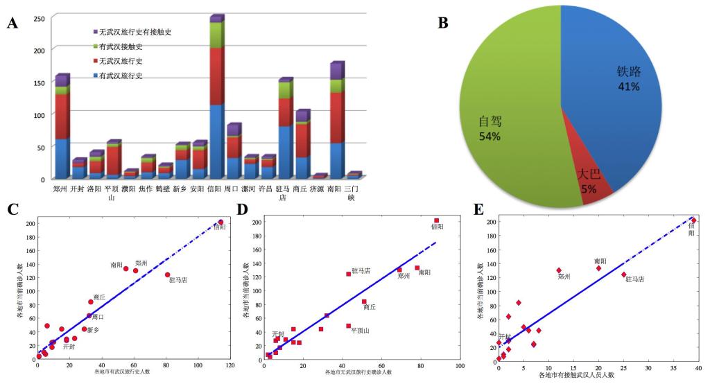 图4. 共计1047例病例中,各地市有无武汉旅行史及接触史与当前各地市确诊人数之间的关系。A. 18地市有无武汉旅行史和接触史人员数量;B. 确诊有武汉旅行史人员交通方式选择;C.各地市有武汉旅行史人员数与当前确诊数散点图;D. 确诊无武汉旅行史人数与当前确诊人数散点图;E. 各地市确诊有接触武汉人员数量与当前确诊人数散点图.