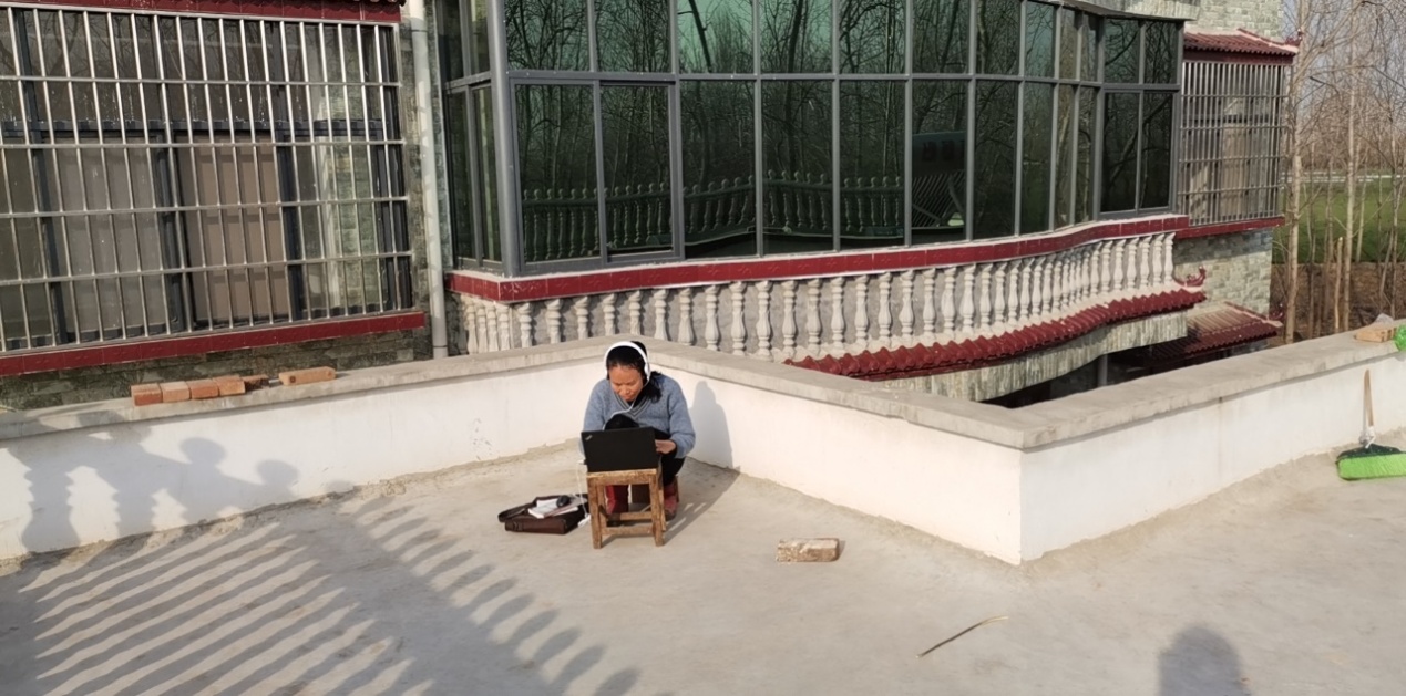 线上教学任务后,马上自己在网上购买了教科书和必须的直播设备。上课时就搬了一个小板凳坐在邻居家的屋顶,蹭邻居家的网络开展教学工作。直播教学过程中经常遇到家里孩子哭闹、网络不通畅、笔记本电脑长时间使用亏电等等困难,但她始终认为无论如何,不能耽误给学生上课。