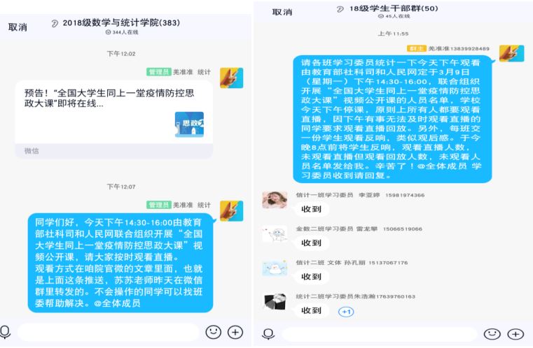 认真组织全体本科生和研究生按时收看由教育部社会科学司与人民网联合组织的 “全国大学生同上一堂疫情防控思政大课”在线直播。“疫情防控思政大课”主要解读以习近平同志为核心的党中央关于疫情防控的决策部署,讲述防疫战疫一线感人故事,发挥高校思政课落实立德树人根本任务的关键课程作用。来自清华大学、中国人民大学、北京师范大学和中央财经大学的四位顶级名师在战“疫”特殊时期“云”授课,与广大学子们共同研讨疫情大考告诉了我们什么、战“疫”青年有怎样的责任和担当等话题。同学们观看后,纷纷总结学习心得,交流疫情期间的感受体会。