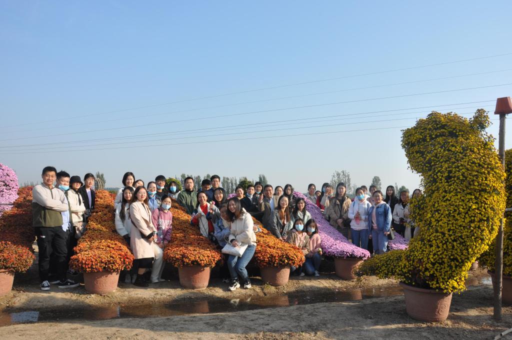 博士研究生导师、现代农业与生物技术研究院副院长、菊花课题组组长王子成教授热情地向师生介绍了基地建设运营、菊花百科、菊文化的丰富内涵等内容,并带领大家参观了科研大棚、种苗繁育室、种质资源(包括食用、药用、茶用及夏菊)菊圃,并就菊花花期调控、新品种培育、嫁接、精品菊花的造型等技术向大家进行详细解说,同时介绍了基地的社会服务活动情况。同学们兴趣盎然,和王教授进行深入交流,通过参观,对菊花的喜爱更深一层,对基地的科研成果转化和先进技术应用表示赞叹,感觉受益匪浅。大家流连于基地田园环境、美丽的菊花丛中久久不愿离开。