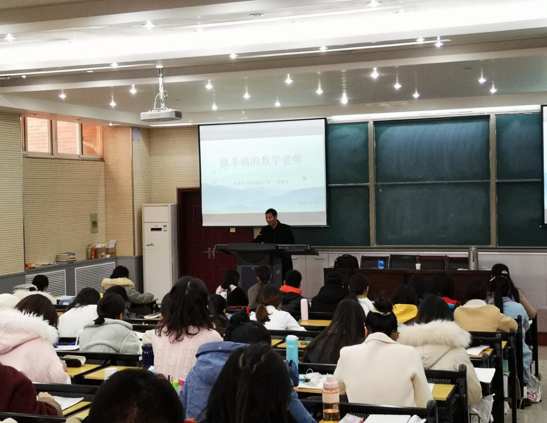 李海军从我国教育形势的发展出发,阐述从事教育工作的平凡、幸福和价值,通过具体实例探讨作为一名数学教师的幸福和价值,分析数学教师专业化成长应该努力的方向,做《如何做一名幸福的数学老师》的讲座。陈君就高中数学核心素养和高中数学教材内容深入分析,结合高中数学实际课堂教学案例,做《核心素养导向下的高中数学课堂教学》的讲座。张满义通过对备教材、备学生、备教法、备自己等几个方面的详细阐述,做《如何准备一节数学概念课》的讲座,并对师范生板书能力的锻炼和提升提出了中肯建议。曹鹏龙做《理性思考与感性碰撞——数学趣味知多少》,结合现在教师队伍浅入浅出、浅入深出、深入浅出、深入深出四种类型提出了自己的看法,介绍教学案例如何引入,分享自身教学经验。四位老师的报告都结合具体课堂教学案例,既有理论的讲解,也有实际教学技巧和教学经验的分享。讲座过程中主讲老师语言生动,实例贴切,气氛活跃,深受学生欢迎。