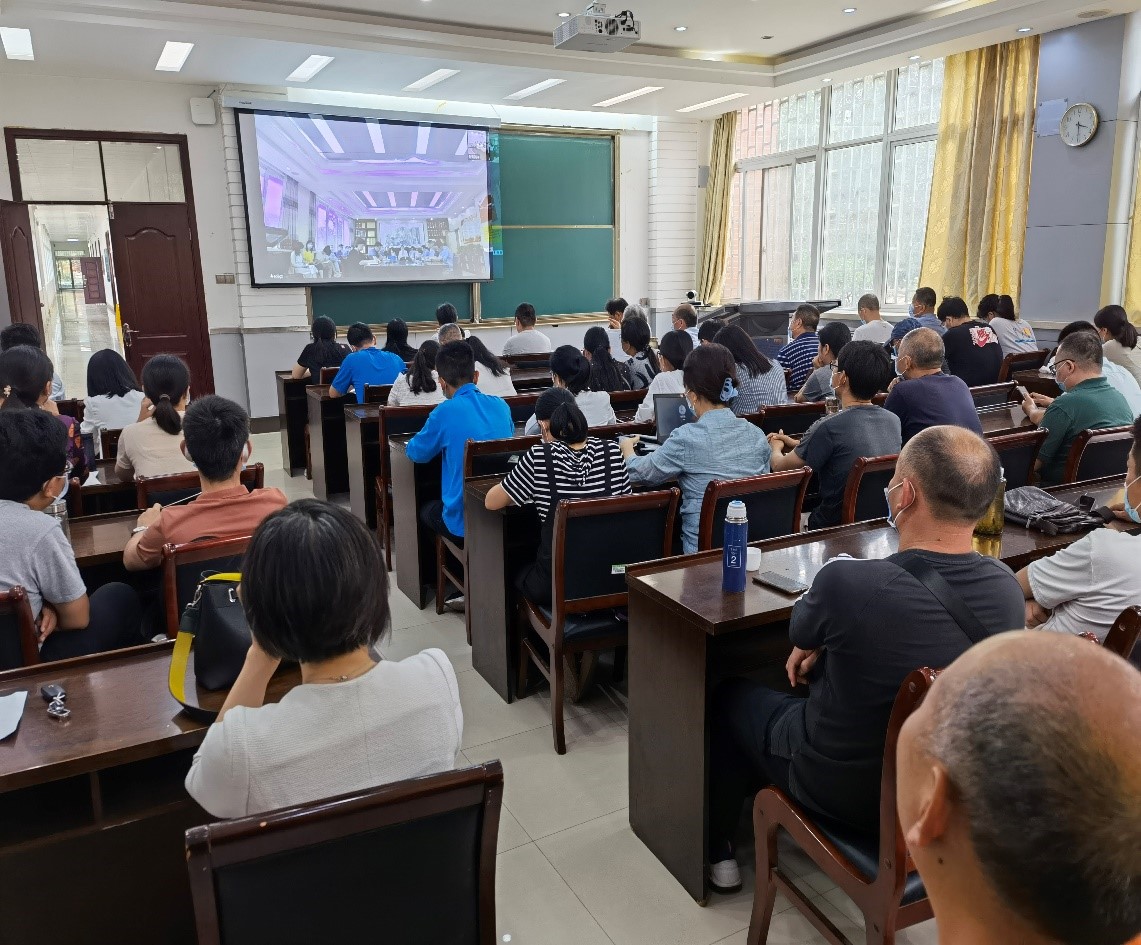 中层干部、全体辅导员在二楼会议室主会场、其他教职工在一楼报告厅等分会场参加会议。院党委书记史富强主持会议。