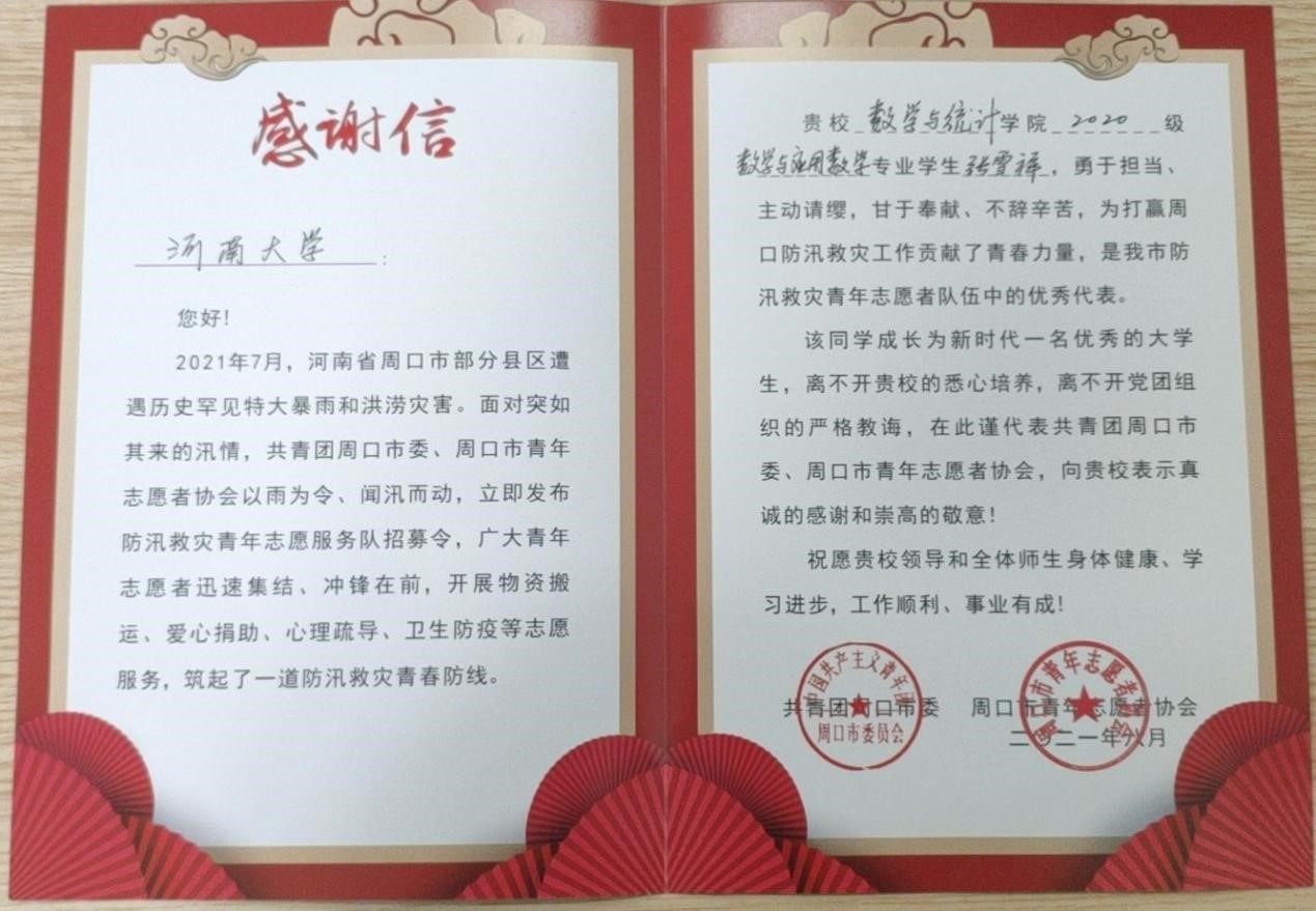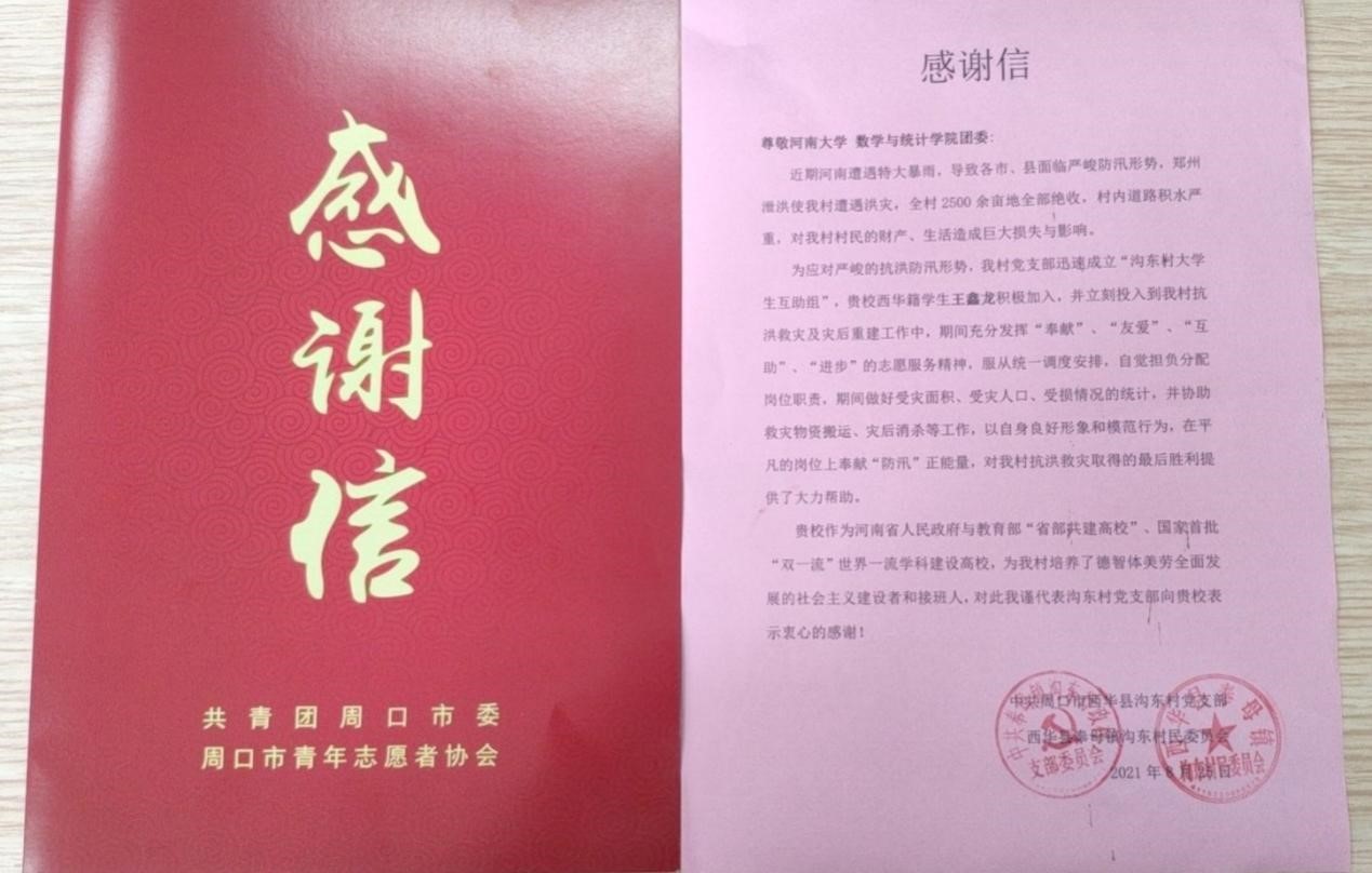 收到两封来自周口市青年志愿者协会和周口市西华县沟东村党支部的感谢信。信中对性爱a片