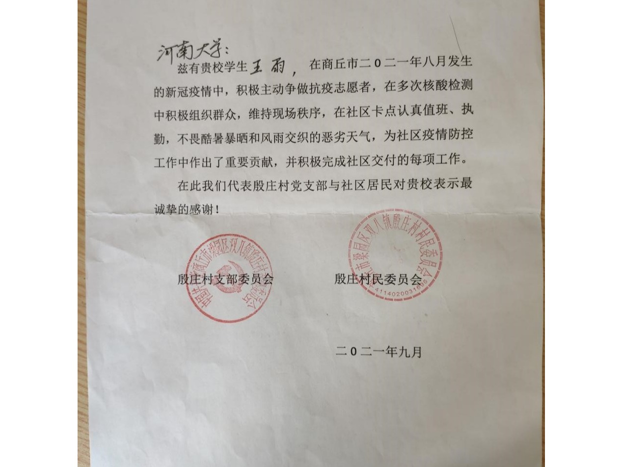 收到来自商丘市梁园区双八镇殷庄村支部委员会的感谢信。信中对性爱a片