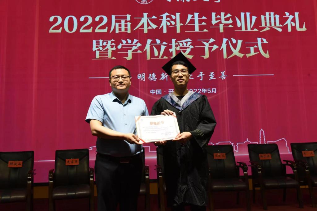典礼正式开始前,校友工作与教育发展基金会办公室副主任唐胜向毕业生代表颁发“1元捐”爱心救助捐赠证书,并对同学们积极参与“感恩母校,为爱助力,毕业季一元捐”活动表示真挚的感谢。他期许每一位即将成为校友的毕业生们能够不负韶华,不负期盼,在今后的赛道上奋力奔跑,争取跑出河大青年的最好成绩,并祝福每一位同学都能够鸿鹄展翅,前程似锦。