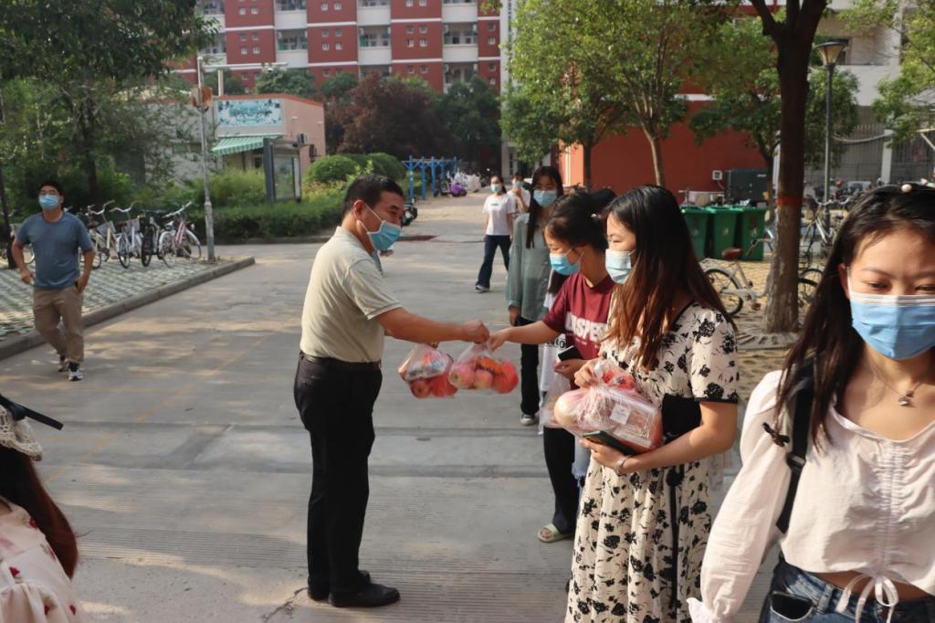 在发放月饼和水果时,师生们亲切交流。老师们向学生致以节日的祝福和问候,关心同学们在校期间的学习、饮食、住宿等情况,向同学们在疫情防控期间对性爱a片