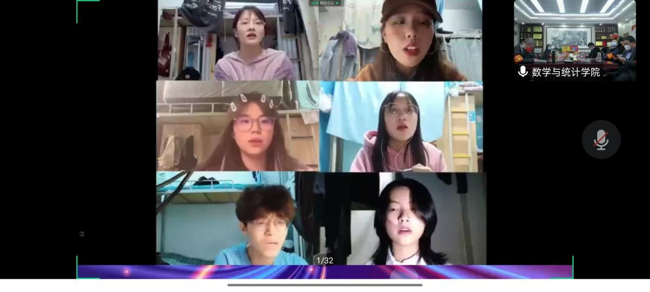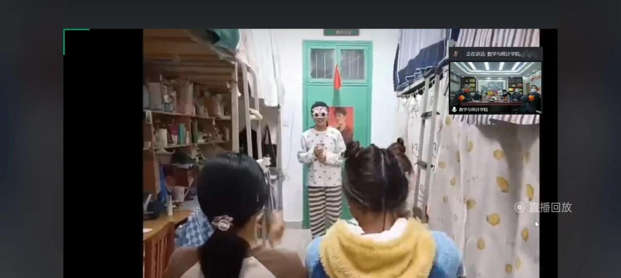 在前期征集到的视频展播环节,小品视频《寝室好声音》亦庄亦谐,令人捧腹。《扣篮大赛》把宿舍当操场,以门框为篮筐,用手球代篮球,表演的花式扣篮惹得观众哈哈大笑,将晚会带到高潮。《熠熠青春逢盛世,奋斗追梦正当时》幽默诙谐地劝诫学生即使在疫情影响下也要拒绝摆烂,刻苦学习,不断成长,让人深思。