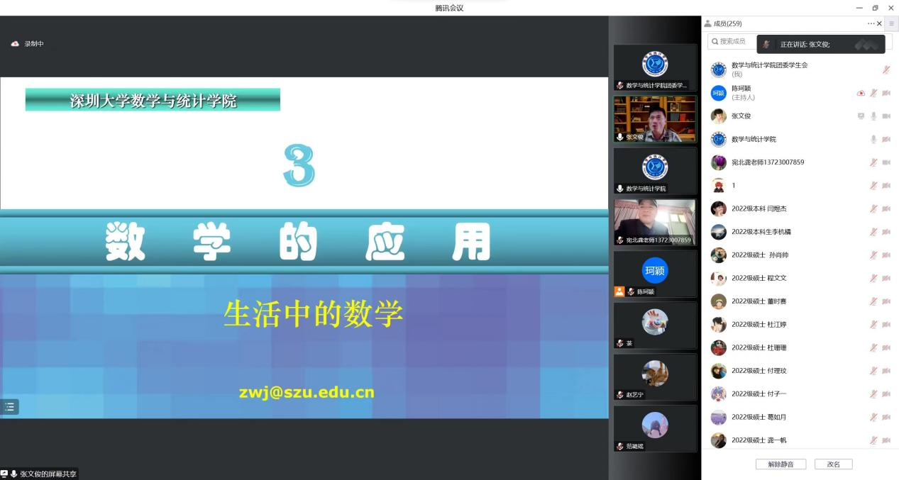 83届优秀校友,深圳大学张文俊教授通过线上的方式给同学们作题目为“例谈数学的智趣用”的趣味科普报告。他通过常见的抽奖问题、约会问题、选举问题、猜心术等9个生活、管理、魔术案例,给同学们讲解了其背后的数学智慧、趣味和应用价值。他的讲座有观点、有案例、有解析,漫谈但不失严谨,通俗却不免深刻,科学又不乏趣味,同学们听得津津有味,兴趣盎然。讲座结束后,线上线下同学们仍意犹未尽,积极参入本次数学文化节的数学互动小游戏中,文化节也同学们的欢声笑语里落下帷幕。
