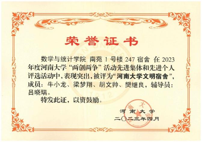 247宿舍成员思想进步,其中牛小龙、梁梦翔为中共党员,胡文帅为预备党员,樊继良为共青团员。他们经常一起学习党的最新理论成果,参加“河南省党员学习贯彻党的二十大精神网络培训班”等。每天晚上通过学习强国APP学习新知识,带头参与每周青年大学习打卡,认真践行“学习新思想,争做新青年“的口号。宿舍成员时刻追求思想先进,始终保持团结友爱的态度,相互支持、帮助。