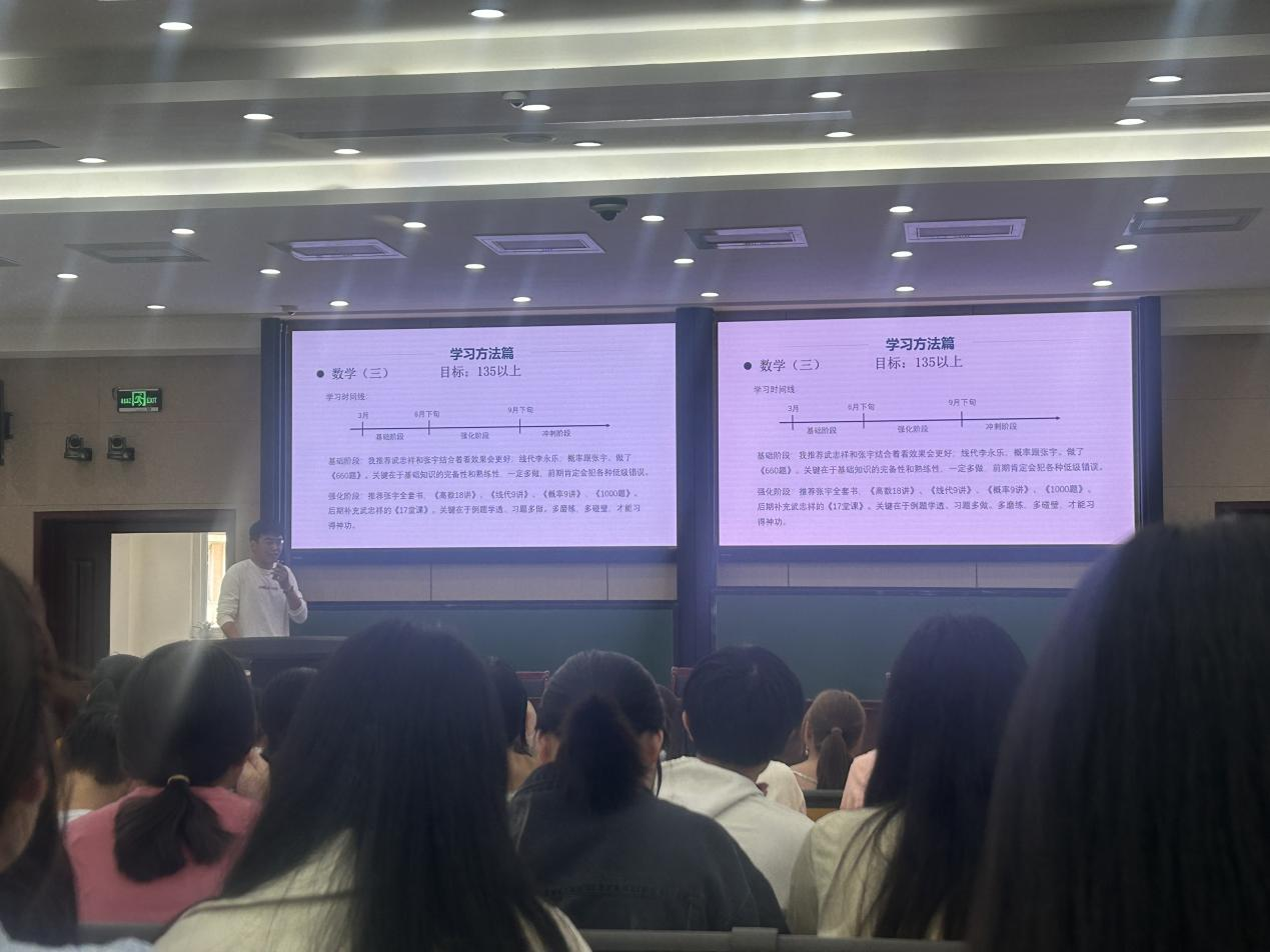,他谈到,要做自己的生涯规划,确定自己的目标,很多科目可以多背模板,多练习模拟题,以此提高自己的复习效率。金融数学专业席腾浩,考研至大连理工大学,强调了择校的重要性,介绍了自己的学习模式以及学习方法。金融数学专业李勇奇,考研至中央财经大学,介绍了择校技巧,选择城市,解答了选择学硕还是专硕的问题,给学弟学妹们介绍了历年录取情况的重要性,以及对应的性爱a片