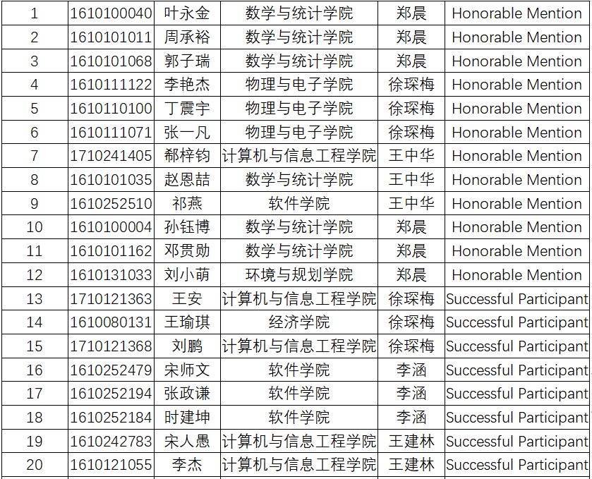 十六、2019年美国大学生数学建模竞赛 获奖11队,其中二等奖(Honorable Mention)4队; 三等奖(Successful Participant)7队 。