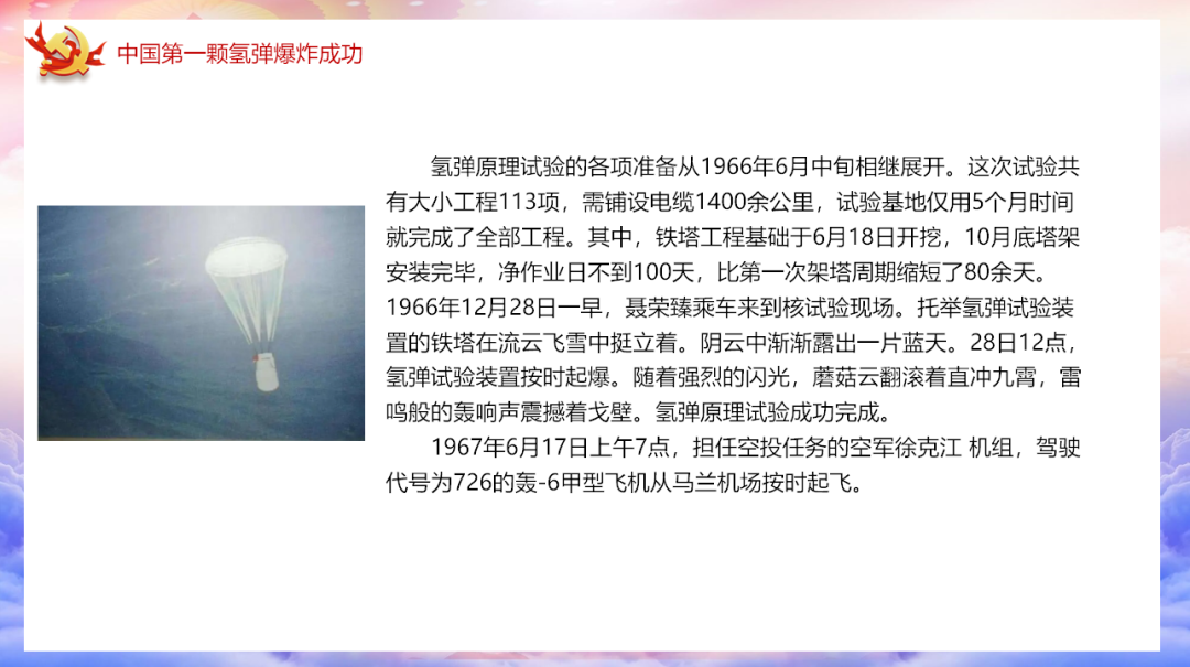 介影讲述1967年第一枚氢弹爆炸,氢弹的成功爆炸为我们提供了长期的和平稳定的发展背景。党的又一次正确决定让我们认识到党的领导是正确的,中国共产党做到了坚持马克思主义基本原理同中国具体实际相结合,我们必须坚定不移地坚持党的领导。
