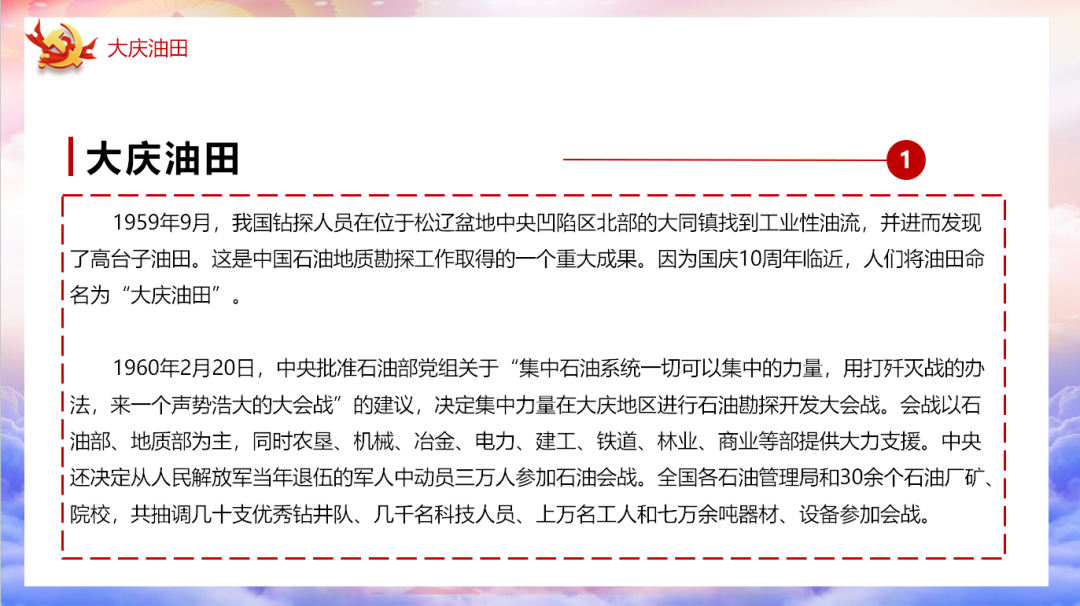 陈艳晓讲解1960年大庆油田投入开发建设,展示出石油文化精神就是一种胸怀全局、心系大局的文化精神,是一种不怕困难、知难而进的文化精神,是一种珍重历史、珍视传统的文化精神,是一种锐意创新、勇于超越的文化精神,是一种以人为本、共建和谐的文化精神。