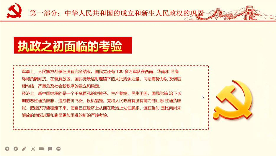 此次学习主要针对1949-1959新中国的成立以及社会主义制度的建立这一段历史。宫嘉艺、马田程、侯金秀三位同学依次以重大历史事件为着力点进行了讲述分享。