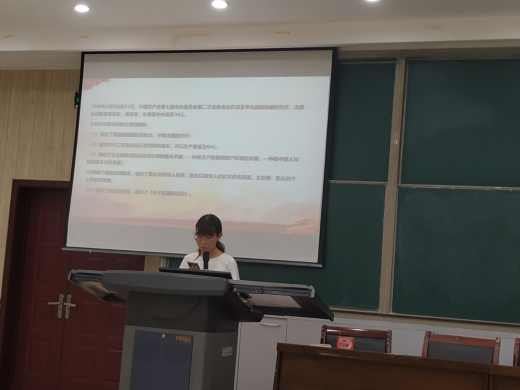 此次学习主要针对1945年到1949年夺取新民主主义革命的全国性胜利这一段历史。王霏、苗颖、吴许畅、李淑婷、孙钰坤五位同学依次以重大历史事件为着力点进行讲述分享。