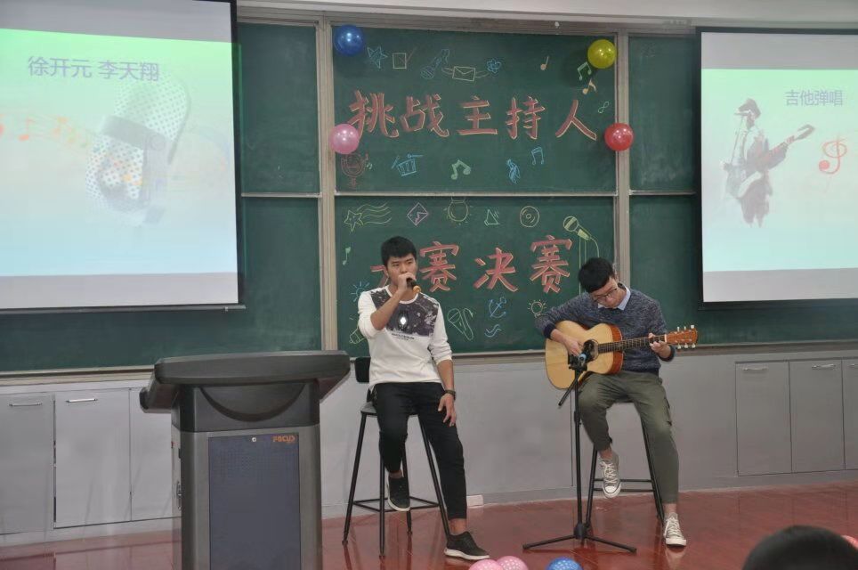 比赛共有三个环节。第一个环节由参赛选手朗读事先所抽取的卡片文字内容并按顺序进行模拟搭档主持。第二环节要求选手现场随机抽取题目应答,考察选手们随机应变能力。在各位选手精彩的表现之后,徐开元同学和李天翔同学为我们带来了精彩的吉他弹唱。
