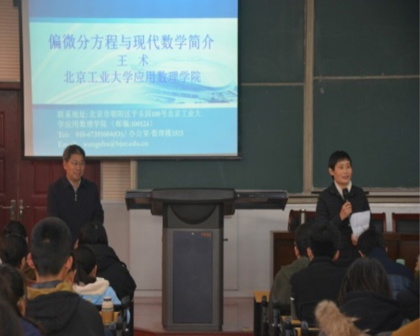 86级校友王术教授做了题为“偏微分方程与现代数学简介”的报告,院长冯淑霞主持报告会。