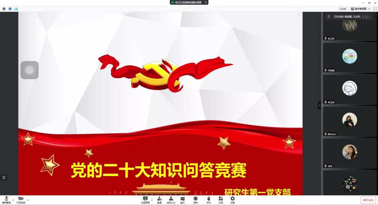 党支部经过前期认真筹备和组织动员,研究生第一和第三党支部全体党员及入党积极分子共100余名同志积极踊跃报名参加本次问答竞赛。竞赛紧紧围绕党的二十大的内容展开,共设置30道题目,满分100分,其中单选20道,多选10道,答题时间为7分钟,到时自动结束答题。